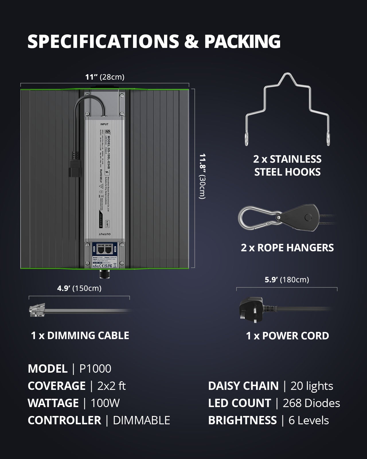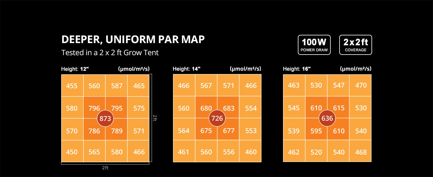 【Coverage Area】Actual power draw is 100W. Perfect for 75x75cm vegetative coverage at 40cm and 60x60cm flowering coverage at 25cm. Remember to properly adjust the height and brightness accordingly to your plants desired level for optimal growth